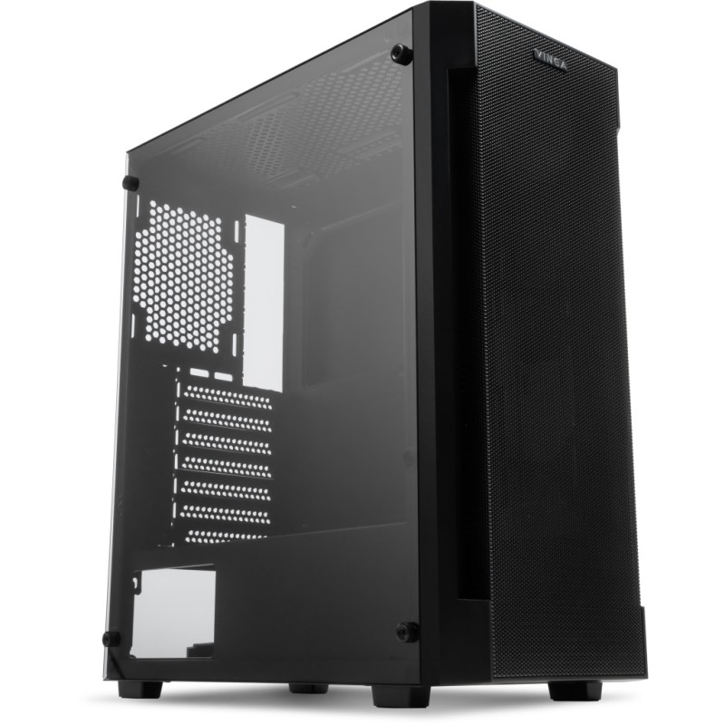 Корпус Vinga Gladius позволит сконструировать неплохой геймерский компьютер: система вентиляции с вентиляционной решеткой обеспечивает нормальный температурный режим даже при полной загрузке. У корпуса есть боковой панели из закаленного стекла - она прозрачная, поэтому пользователь может увидеть, как работает "начинка" корпуса. Место для блока питания находится на дне корпуса, это помогает погасить вибрацию и сделать уровень шума ниже даже при полной нагрузке. На корпусе расположены кнопки управления питанием и загрузкой системы, а также входы для наушников, USB-порты и входы для микрофона. Максимально допустимый размер карт для установки - до 340 мм, максимально приемлемая высота кулера - 165 мм.